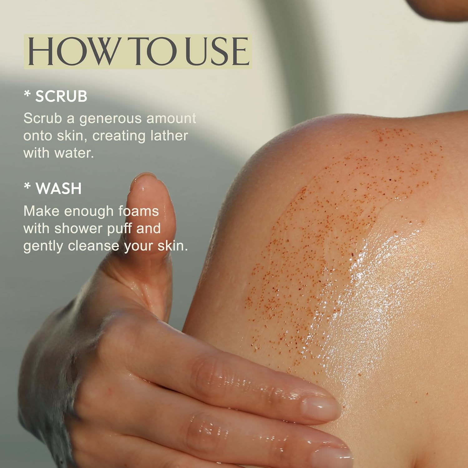 - 1. SCRUB + WASH AT THE SAME TIME: With fine walnut shell powder, a dual action(a gentle body scrub + moisturizing wash) effectively removes dead skin cells, sebum, and impurities while leaving the skin smooth and soft.